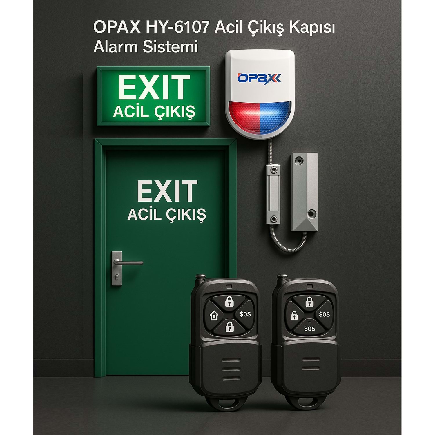 Bu sistem; kapıya monte edilen kablolu manyetik kontak ile, gerekiyorsa ilave kablosuz kapı sensörleri ve bunların hepsini yöneten Opax HY-6107 tabanlı acil çıkış kapısı alarm paneli ile birlikte çalışır. Kapı, yetkili personel butona basmadan açılırsa, kilit zorlanırsa veya kapı direkt açılırsa sistem anında alarm verir.