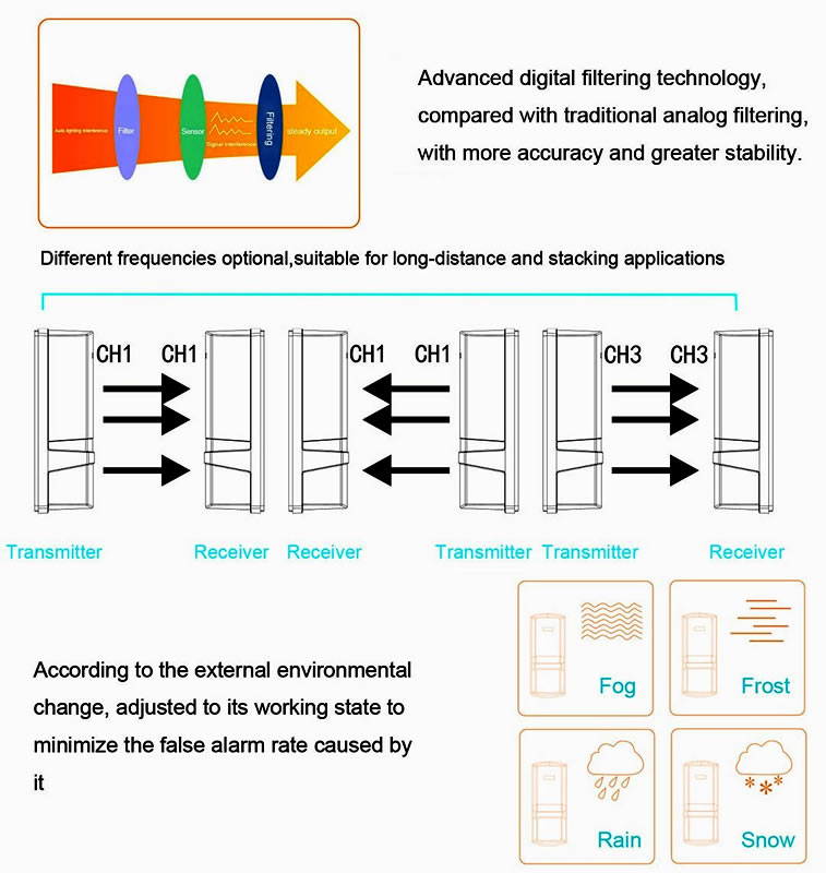 ABH-250L 4 Işınlı Işın Bariyeri, geniş açık alanlarda yüksek güvenlik seviyesi ve düşük yanlış alarm oranı sunan profesyonel bir çözümdür. Endüstriyel tesislerden ev bahçelerine kadar pek çok alanda, izinsiz girişleri anında tespit ederek caydırıcı bir rol oynar. Kolay kurulumu ve zorlu hava şartlarına dayanıklılığı ile mülkünüzü proaktif bir şekilde korur.