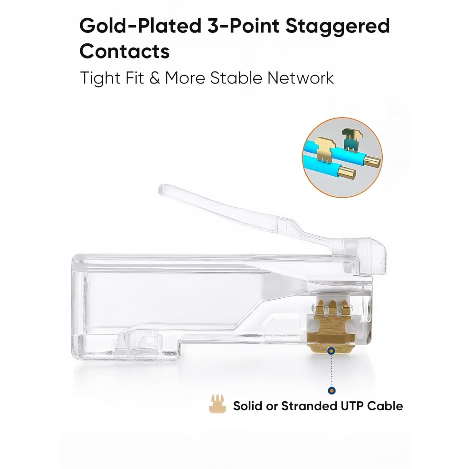 Paket içeriği: 100 Adet RJ45 CAT6 UTP konnektör. Şeffaf PC gövde, altın kaplama pin ve güçlendirilmiş tırnak yapısı.